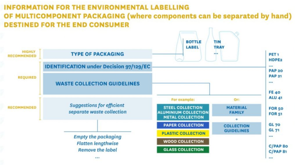 Packaging systems that envisage a main body and other ancillary components that cannot be separated manually (e.g. adhesive labels, non-separable caps and closures, windows), must indicate the identification coding of the main body material, and collection instructions (which follow the main body material).