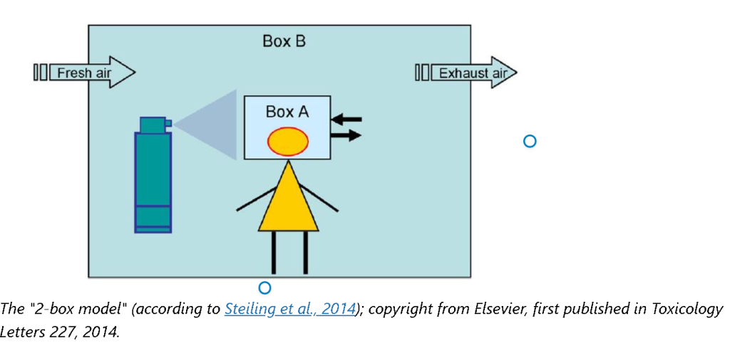 On the one hand, for the "1-box model", the assumption is that the spray is instantly released and distributed in a Box A around the head. On the other hand, the "2-box model" is the worst-case scenario as this takes into account the duration of exposure in both near-field around the head (Box A) and far-field (e.g., bathroom), (Box B). The "2-box model" considers the dilution of the substance over time. There, the aerosol is present for exposure over a defined time, after which the full amount of aerosol in the first box (Box A) is transferred to a larger second Box B.